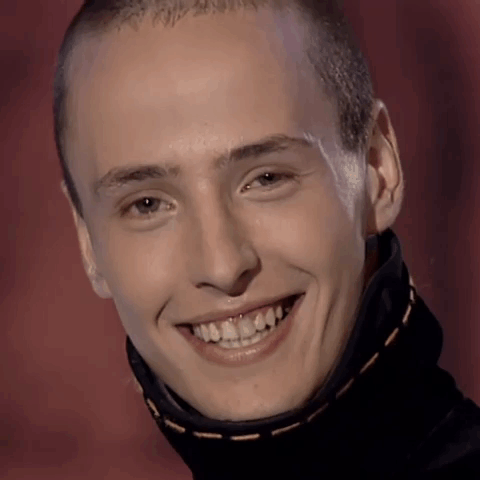 Vitas (Vitali Vladassovitch Gratchiov) smiles warmly in a close-up, wearing a black turtleneck.