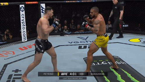 two men are fighting in a boxing ring and one of them is wearing shorts that say ufc