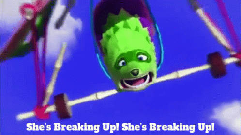 Fergy Fudgehog from Viva Pinata in a hand-gliding mishap, exclaiming 'She's Breaking Up!'