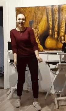 Vivi Psionline dancing energetically in front of a large golden Buddha painting, showcasing her moves.