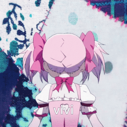 Madoka Kaname, a pink-haired anime girl, turns to reveal 'vivi' on the back of her outfit.