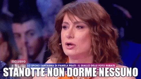 Vladimir Luxuria discusses the Pamela Prati scandal on Italian TV, with the caption "No One Sleeps Tonight" displayed.