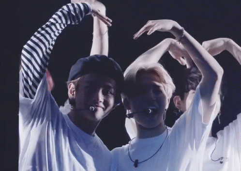 Vmin (V and Jimin) from BTS make a heart gesture with their arms on stage, smiling at the audience.
