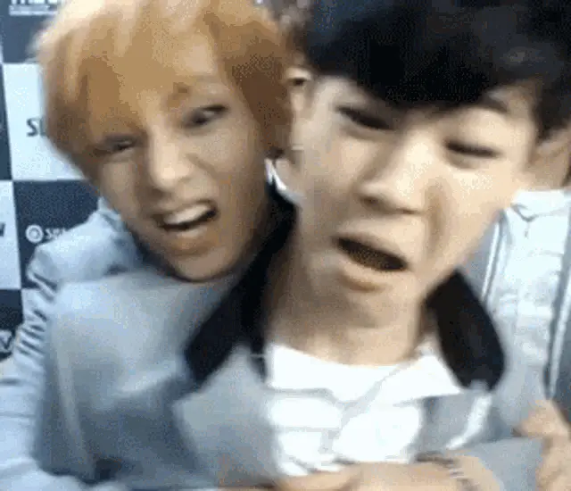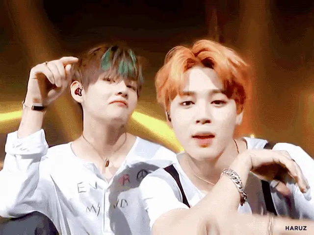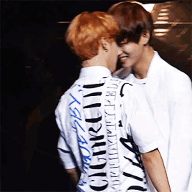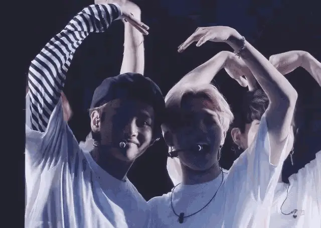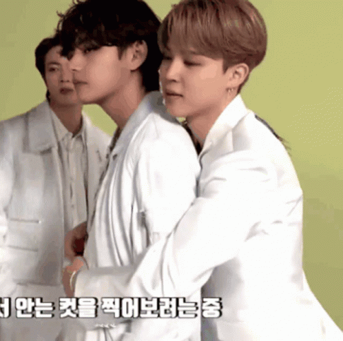 Jimin embraces Taehyung from behind while Jin looks on, a sweet moment between the BTS members.