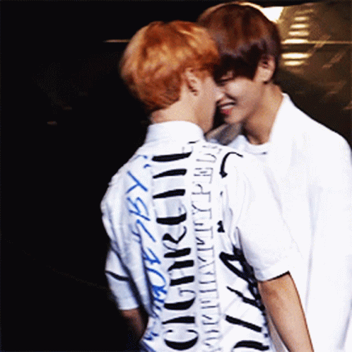 Vmin share a sweet, intimate moment, standing close and smiling at each other.