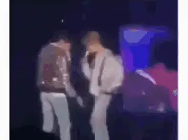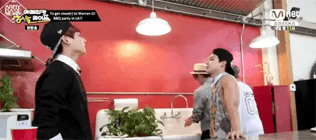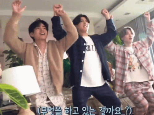 Vminkook members dance playfully in a living room, arms raised in excitement.