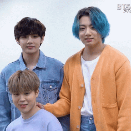 BTS members V, Jimin, and Jungkook share a joyful moment, smiling and laughing together.
