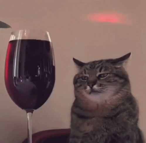 Vmnlvi the cat sits contemplatively next to a large glass of red wine, illuminated by colorful party lights.