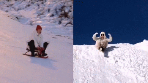 Vmnlvi and Vmin enjoying a snowy day, with one person sledding down a hill and the other sitting in the snow.