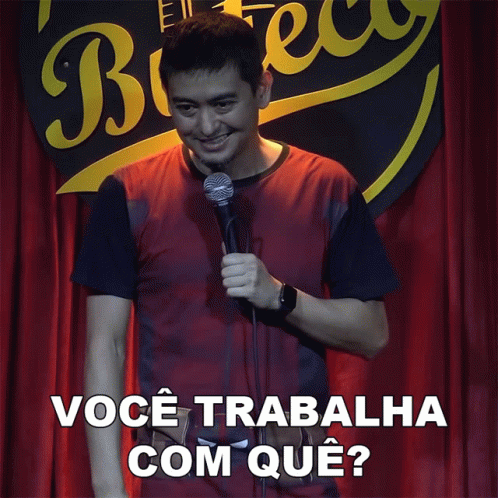 Andre Santi, a comedian, asks 'Você Trabalha Com Quê?' (What Do You Do For A Living?) on stage with a microphone.