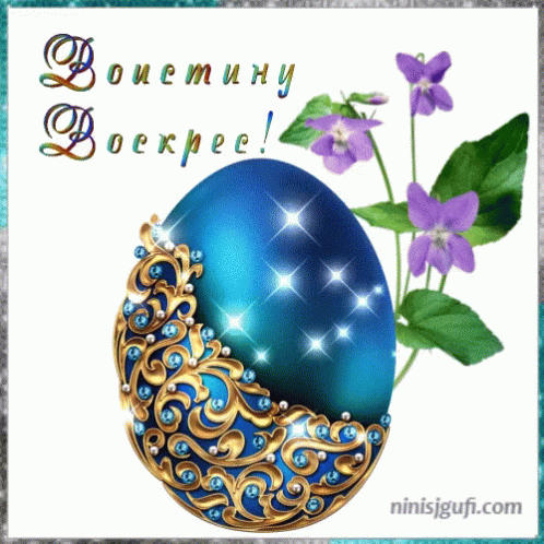 A vibrant Easter greeting card featuring an ornate green egg, purple violets, and the Russian phrase 'Voistinu Voskres!'.
