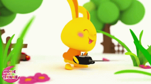 A cheerful yellow bunny from Monde des Titounis plays with a red remote control car in a vibrant garden.