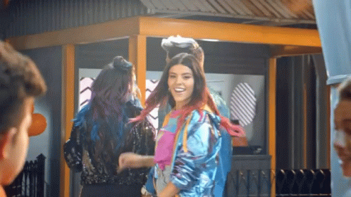 Los Polinesios react with surprise, turning around as if someone called them in a vibrant setting.