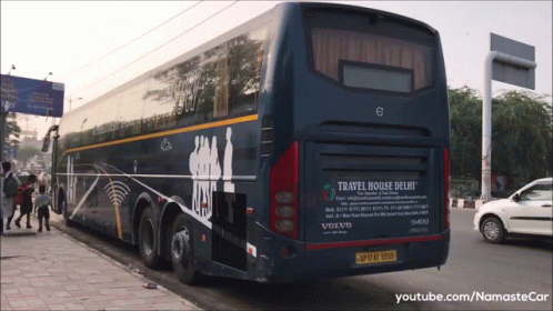 Rear view of a Volvo 9400 bus from Travel House Delhi, parked on a street in India.