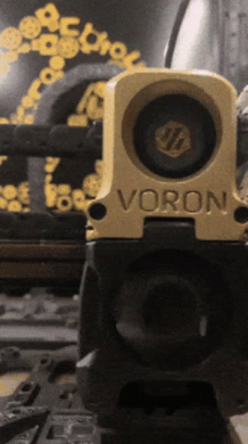 Close-up of a VoronDesign 3D printer Afterburner toolhead, featuring the 'VORON' logo.