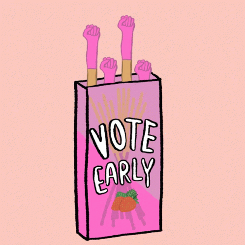 An animated illustration of a pink Pocky box with 'VOTE EARLY' text and raised fists.