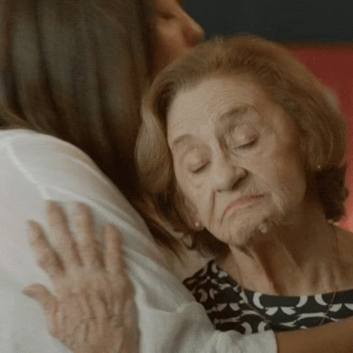 Vovó Laura Cardoso is embraced, looking sad and emotional during a comforting hug.