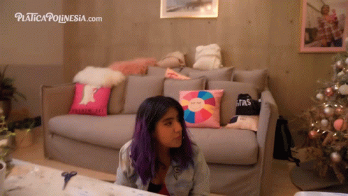 Karen Polinesia, com cabelo morado, sentada frente a um árvore de Natal, oferece ajuda dizendo '¡Voy A Ayudarte!'.