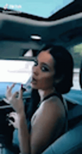 A woman in a car looks back, smiling and moving her mouth as if singing or talking.