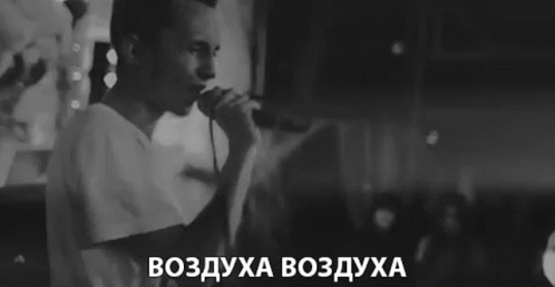 A black and white video of a singer from the Russian musical group "Воздуха Воздуха" performing live.