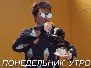 A man from Время и Стекло, Имя 505, comically pours coffee on a Monday morning, reflecting the struggle.