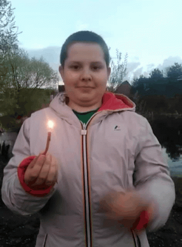 Лёха (Lyokha) holds a lit candle outdoors in Sekirino, reflecting the theme of prayer.
