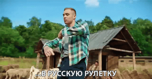Egor Creed dancing in a plaid shirt in a rural setting, with captions referencing Russian Roulette.