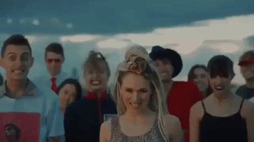 A diverse group of young people, including a woman with a flower in her hair, smiling and excited.