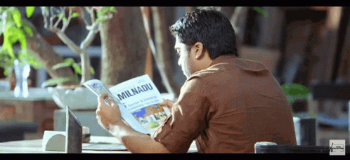 Simbu as Karthik from VTV reading a 'Milnadu' magazine at a table in a relaxed setting.