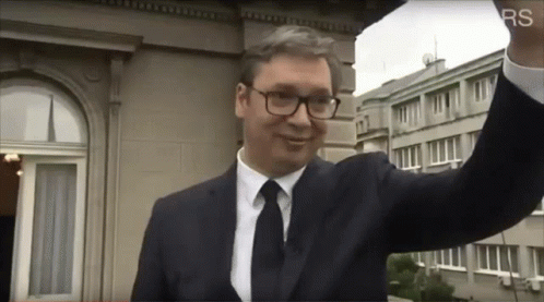 Aleksandar Vucic waves from a balcony, smiling at the crowd below during a public appearance.