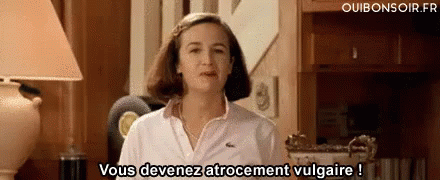Woman in a white Lacoste shirt declares "You are becoming atrociously vulgar!" with a serious expression.