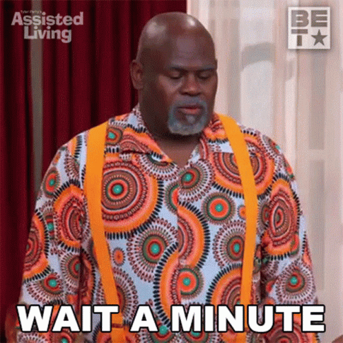 Mr. Brown from Assisted Living reacts with a 'Wait A Minute' in his signature colorful shirt and suspenders.