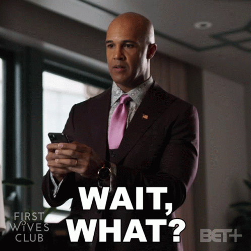 David Montgomery, played by Mark Tallman, looks confused while checking his phone, with the caption 'WAIT, WHAT?'