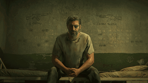 A grizzled man with an eyepatch sits in a grim cell with Russian text and gun drawings on the wall, from Call of Duty Black Ops 6 Zombies Terminus Cinematic Trailer.