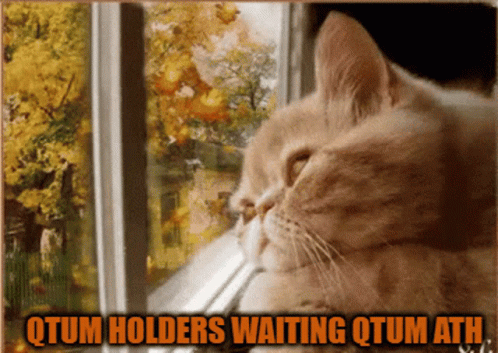 A cat looks out a window at an autumn scene, with text 'QTUM HOLDERS WAITING QTUM ATH' overlaid.