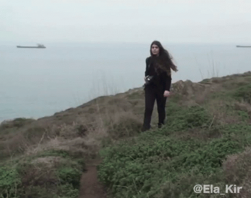 Ela Kir walking along a grassy cliffside overlooking the ocean with ships in the distance.
