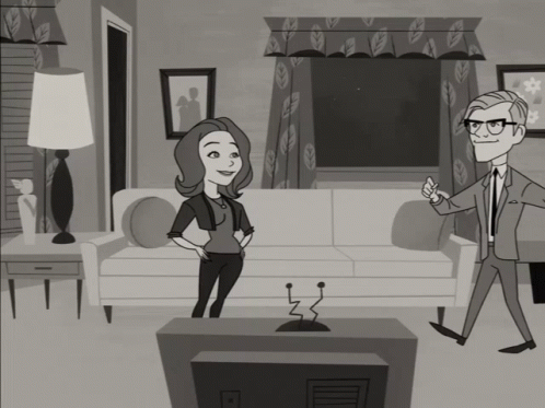 Animated intro featuring Wanda Maximoff and Vision in a retro black and white living room, setting the scene for Wandavision.