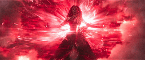 Wanda Maximoff, as Scarlet Witch, unleashes her powerful red magic in a dramatic scene from Wandavision.
