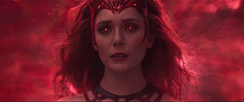 Elizabeth Olsen as Scarlet Witch (Wanda Maximoff) with glowing red eyes and her iconic headpiece in Wandavision.