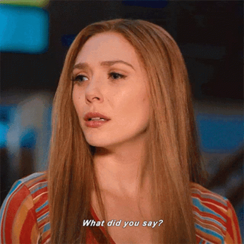 Wanda Maximoff, played by Elizabeth Olsen, reacts with a pained expression, asking 'What did you say?' in WandaVision.