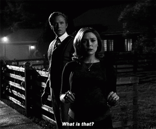 Wanda Maximoff and Vision from WandaVision look concerned at night, asking 'What is that?'