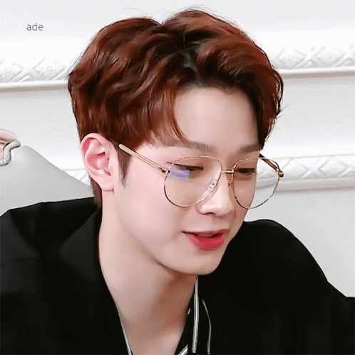 Wanna One's Lai Guanlin smiling while wearing stylish gold-rimmed glasses.