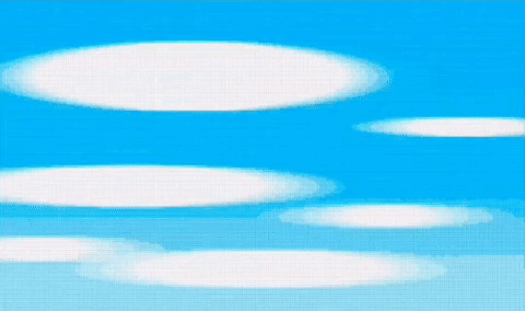 A cute Wannyan Idol witch flies on her broomstick across a blue sky with clouds.