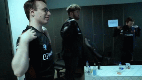 Fnatic players warm up in the locker room, stretching their arms and shoulders before a match.