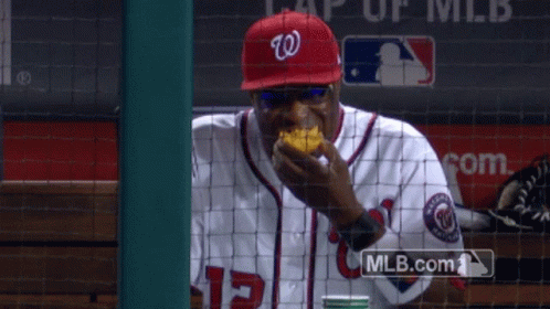 Dusty Baker, manager of the Washington Nationals, enjoys a refreshing peach snack during a baseball game.