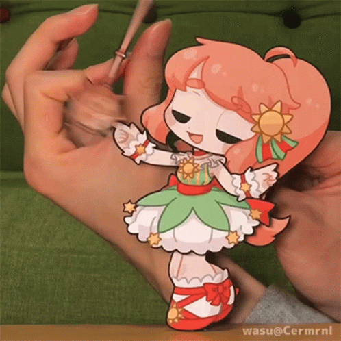 Wasu Art's charming baton twirler character winks and holds a mace, brought to life by a person's hands.
