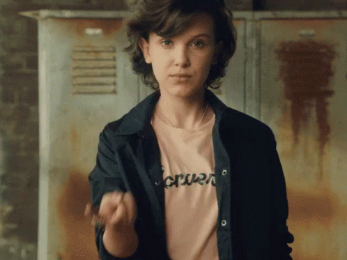 Millie Bobby Brown makes an 'I'm watching you' gesture, promoting Converse with a confident look.