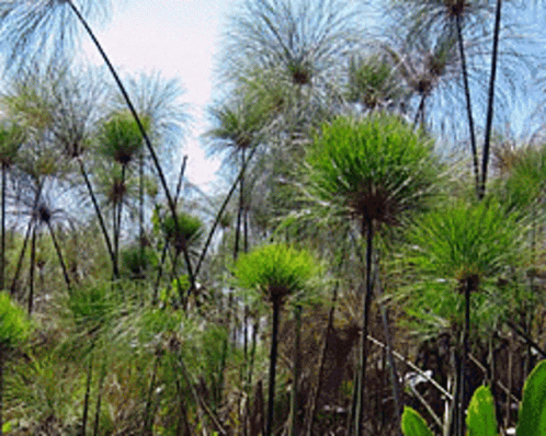 Tall papyrus plants with distinctive umbrella-like tops, growing in a natural, watery environment.