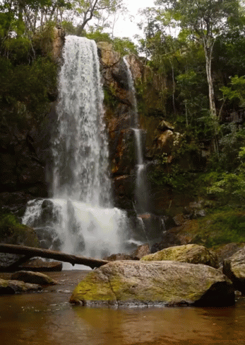 A majestic waterfall cascades down rocky cliffs surrounded by vibrant green trees in a serene forest.