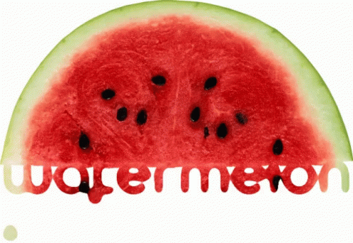 A vibrant half-slice of watermelon with the word 'watermelon' cut out, dripping red juice.